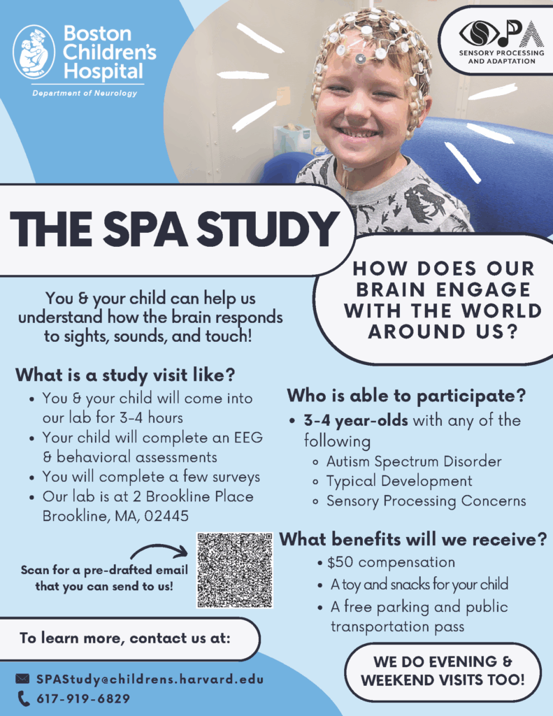 Dr April Levin and her team at the Department of Neurology at Boston Children’s Hospital are seeking to understand how different individuals process sensory information. Hopefully this understanding will lead to improved intervention for individuals experiencing sensory processing difficulties. The SPA project is recruiting three groups of children 3-4 years of age: children with autism, children with “sensory processing concerns” who do not also have autism, and children with typical development.